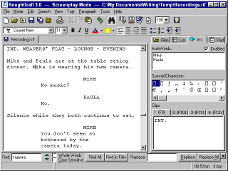 2. RoughDraft in Screenplay Mode., which makes formatting of film and TV plays simple. The Find Bar is also open at the bottom of the window - this lets you search the file without obstructing your text.
